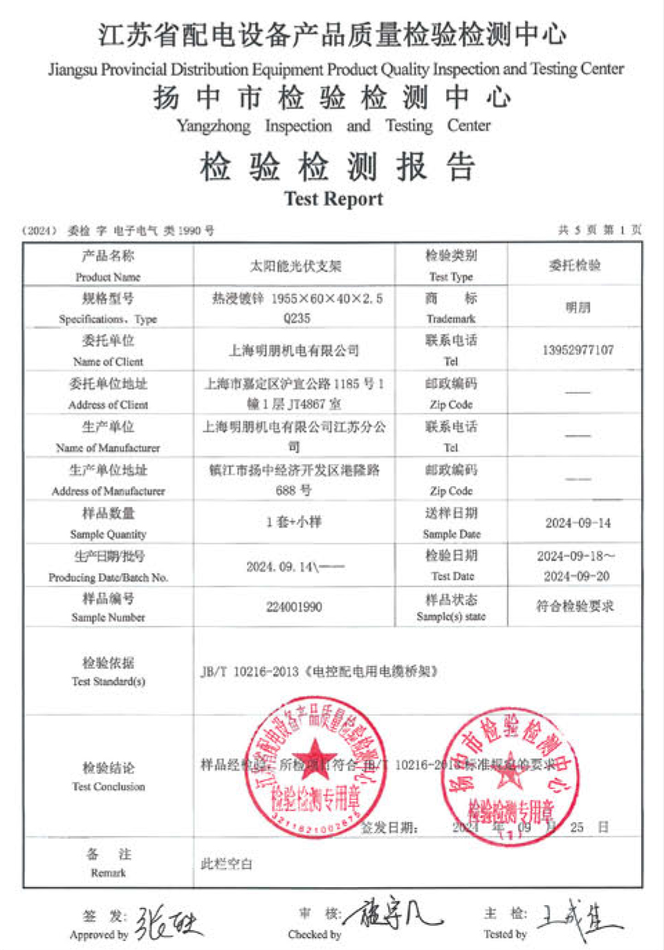 太阳能光伏支架检验检测报告