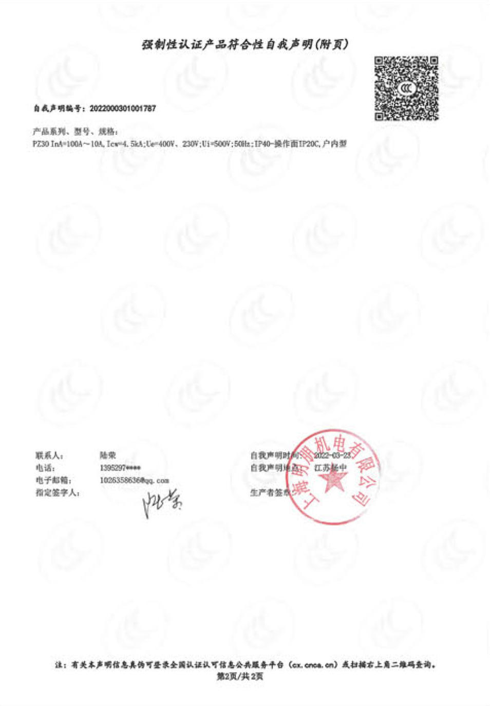PZ30照明配电箱自我声明