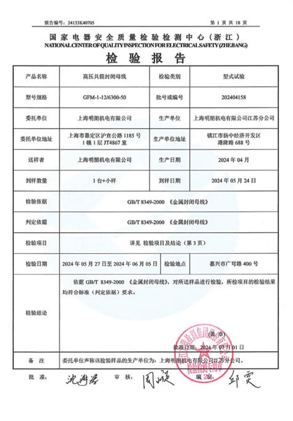 高压共箱封闭母线检验报告