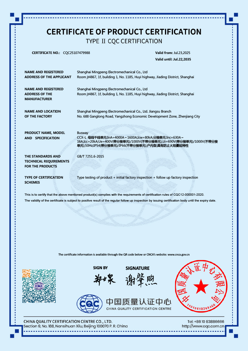 CCX-L 母线槽 4000A~1600A 产品认证证书