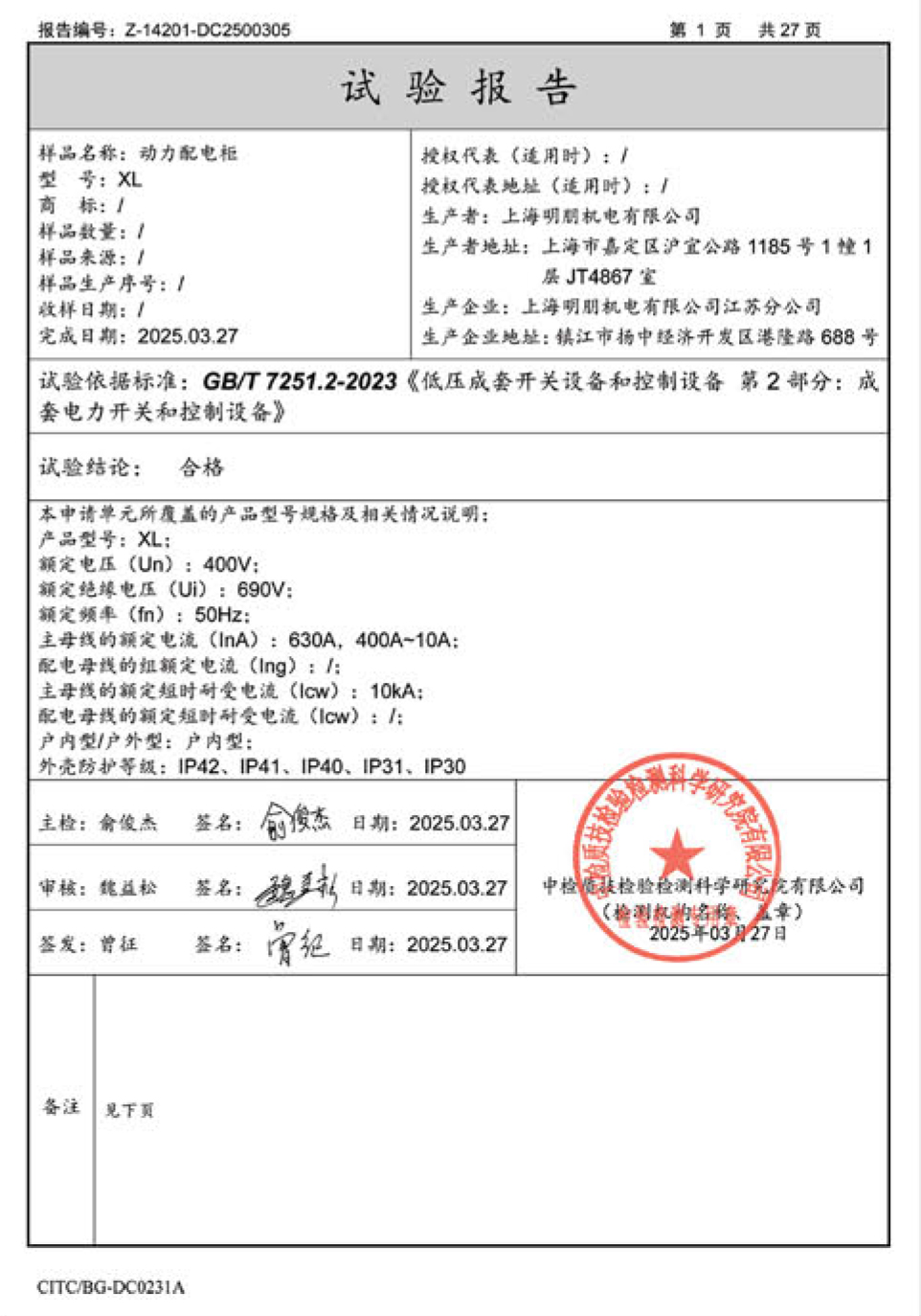 XL东西配电柜型式试验证书